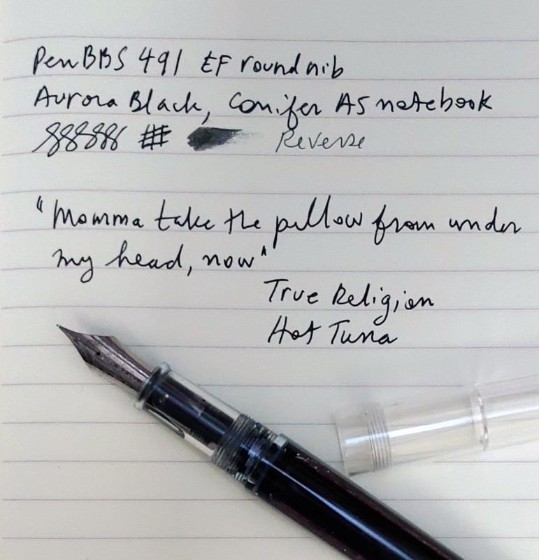 I got my 491 with a round EF nib. I've been wanting to try that nib in an eyedropper pen since I experienced it in the PenBBS 352, the pen that introduced the EF nib. Unfortunately, the construction of the 352 precluded eyedroppering - there's no o-ring on the section and the barrel has a screw-in finial cap.